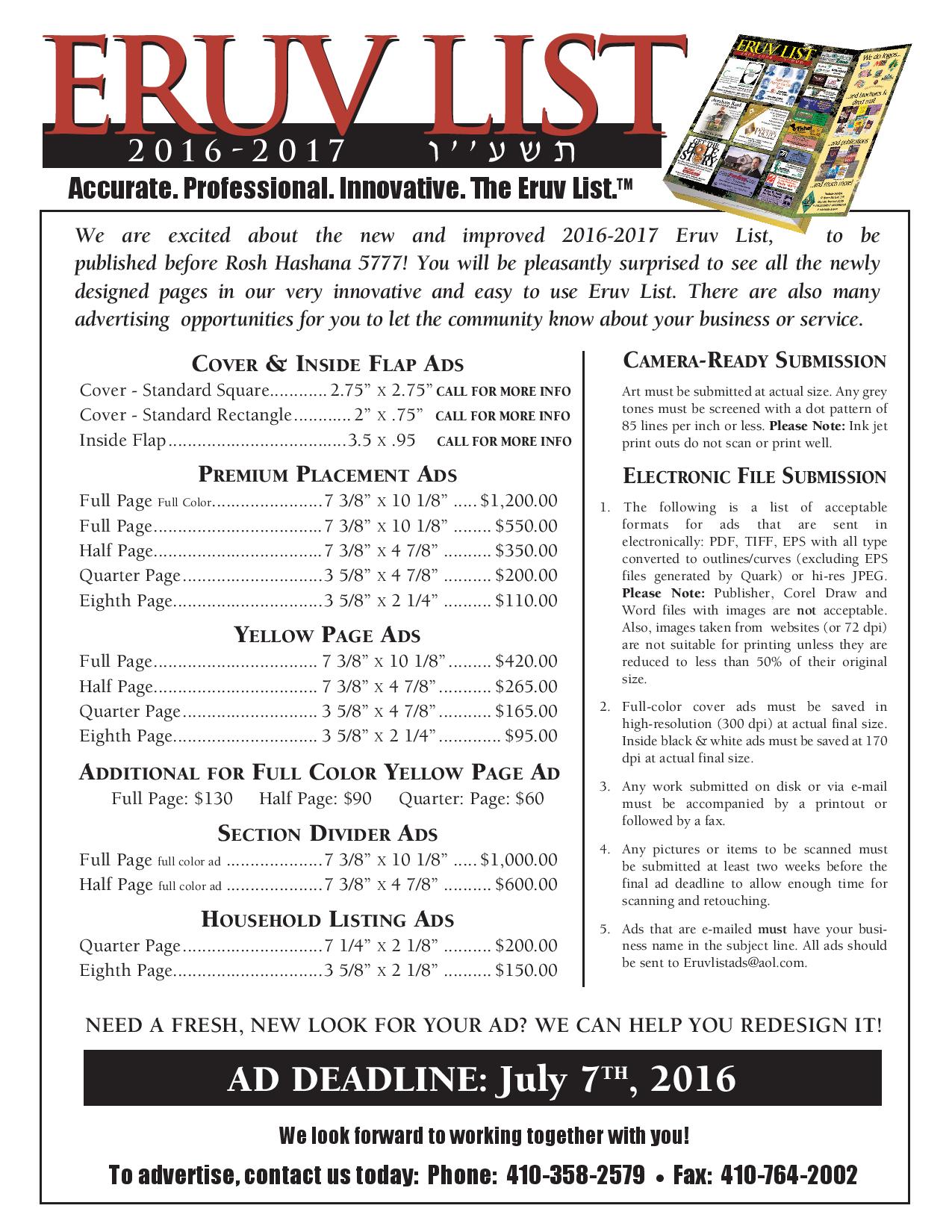 The Eruv List is very well organized. It will be very easy for your clients to find your phone number whether they are searching by subject or by name.
